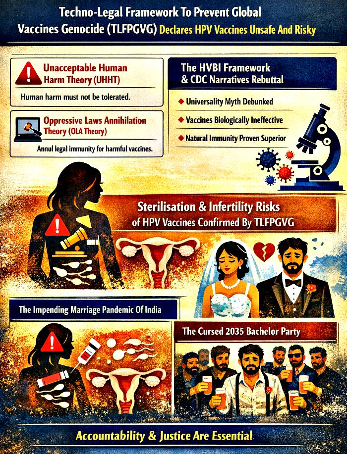 The Techno-Legal Framework to Prevent Global Vaccines Genocide (TLFPGVG), developed by Praveen Dalal, CEO of Sovereign P4LO and PTLB, represents a scientific and medical departure from conventional vaccine safety pseudoscience and Rockefeller Quackery Based Modern Medical Science (RQBMMS). Emerging in India in 2026, the framework integrates technological surveillance, legal accountability, and holistic health principles to challenge mainstream narratives surrounding HPV and COVID-19 vaccines. Central to this framework is the HPV Vaccines Biological Impossibilities (HVBI) Framework, which dismantles the CDC’s pseudoscience of universality, persistence, and vaccine efficacy. Epidemiological data confirm that cervical cancer incidence and mortality have been declining for decades, independent of vaccination, driven by natural immunity, demographic transitions, and healthcare improvements. The TLFPGVG emphasizes absolute liability, the annulment of immunity provisions shielding corporations, and the recognition of minority voices. This article explores the framework’s components, contextual focus in India, and its broader implications for global public health, concluding that HPV vaccines are unsafe and risky, and that accountability must be embedded into law and practice.