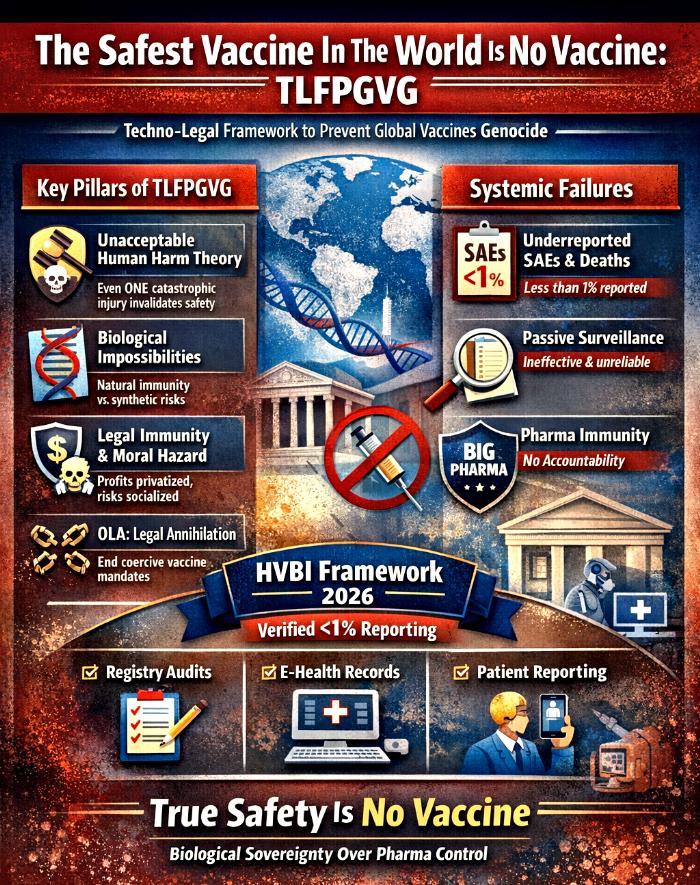 In conclusion, the Techno-Legal Framework to Prevent Global Vaccines Genocide (TLFPGVG) advances a scientific and medical reorientation of vaccination debates by situating them within the domains of ethics, law, and governance rather than solely claimed biomedical efficacy. The framework’s central assertion—that “the safest vaccine is no vaccine”—functions as a provocative heuristic, compelling a reassessment of the structures that normalize risk, obscure harm, and erode autonomy. Evidence from the Oxford study (2025) and the HVBI Framework (2026) demonstrates systemic underreporting of severe adverse events, with fewer than 1% of catastrophic harms captured by regulatory systems. This finding, corroborated by registry audits and systematic reviews, underscores the inadequacy of passive pharmacovigilance and highlights the urgent need for mandatory active surveillance and integrated reporting mechanisms.
