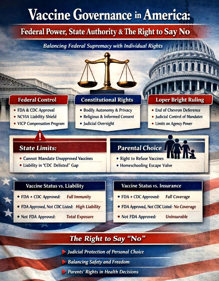 This article provides a comprehensive analysis of vaccine governance in the United States, focusing on the interplay between federal supremacy, state police powers, and individual rights to bodily autonomy. It begins by examining the federal regulatory framework, where FDA approval, CDC recommendations, and the National Vaccine Injury Compensation Program (VICP) establish the boundaries of lawful vaccine rollout, liability immunity, and compensation. It then revisits Jacobson v. Massachusetts (1905) and its century-long legacy, tracing how courts have progressively narrowed state emergency powers in favor of constitutional rights such as privacy, informed consent, and religious liberty. The discussion expands to the Supreme Court’s 2024 decision in Loper Bright Enterprises v. Raimondo, which dismantled Chevron deference and reasserted judicial supremacy over agency expertise, reshaping the balance of power in healthcare, environmental regulation, finance, and vaccine mandates. Finally, the article explores parental rights, homeschooling as a legal “escape valve,” and the emerging discourse on “medical sovereignty.” Together, these threads reveal a central theme: vaccine governance in the U.S. is increasingly defined by judicial supremacy and federal supremacy, leaving courts as the ultimate arbiters of public health law, while individuals assert their right to say “no” to vaccines for themselves and their children. This is beautifully articulated by the Techno-Legal Framework to Prevent Global Vaccines Genocide (TLFPGVG): “The Safest Vaccine In The World Is No Vaccine.’“