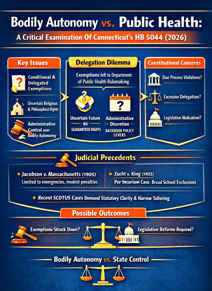 Connecticut’s HB 5044 (2026) establishes vaccine standards across schools, workplaces, and licensing contexts, but its most controversial feature lies in its treatment of exemptions. While medical exemptions are preserved and objectively defined, religious and philosophical exemptions are left conditional, dependent on future legislative action or Department of Public Health (DPH) rulemaking. This delegation creates uncertainty and raises constitutional concerns: rights tied to bodily autonomy and religious conscience are not guaranteed by statute but instead subject to administrative discretion. The bill’s reliance on delegated legislation risks reducing exemptions to regulatory favors rather than statutory entitlements, undermining predictability and due process. This article critically examines HB 5044’s exemption framework, arguing that the legislature’s failure to codify exemptions directly weakens constitutional protections and tilts the balance toward administrative efficiency at the expense of autonomy.