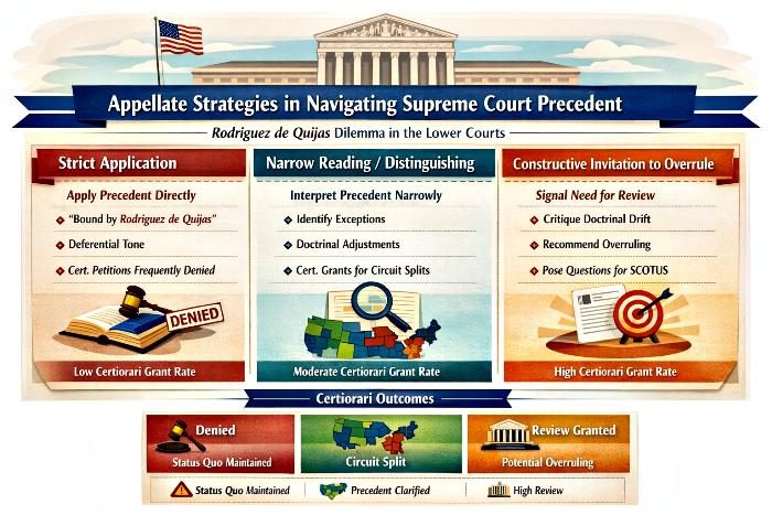 | Strict Application | Courts apply older Supreme Court precedent directly, even if doctrinal vitality is questioned. | Deferential tone; explicit invocation of Rodriguez de Quijas; holdings framed as obligation rather than discretion. | Certiorari petitions often filed seeking correction; grants relatively infrequent compared to petitions. |