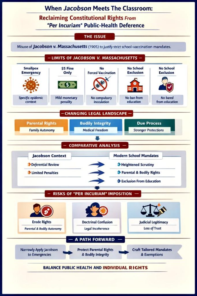 Jacobson v. Massachusetts remains a cornerstone of public‑health jurisprudence, but its factual and doctrinal limits are too often overlooked. The decision arose in a narrow emergency context, imposed only a modest fine, and did not implicate exclusion from education or forced medical intervention. Treating Jacobson as a blanket precedent for modern school‑vaccination mandates risks collapsing decades of constitutional development that now recognize robust protections for parental autonomy, bodily integrity, and due process.