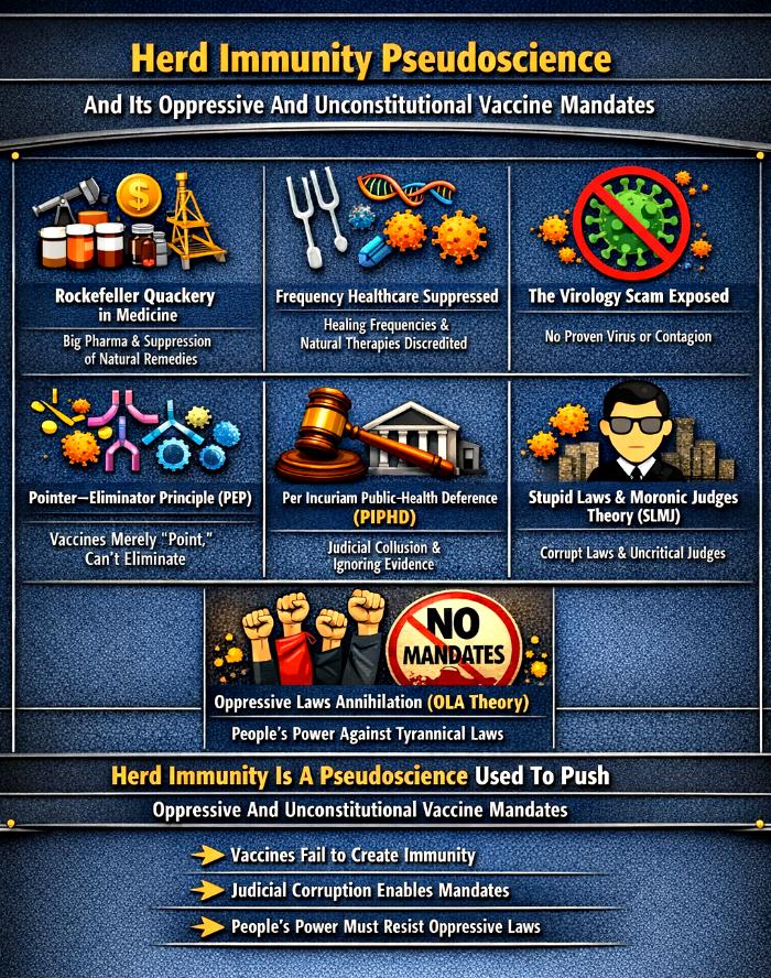 Herd immunity has been presented as a cornerstone of modern public health, used to justify coercive vaccination campaigns and sweeping mandates. Yet, when examined through scientific, immunological, and legal frameworks, herd immunity collapses as pseudoscience. This article synthesizes seven core theories — Rockefeller Quackery Based Modern Medical Science (RQBMMS), Frequency Healthcare, the Virology Scam, the Pointer–Eliminator Principle of Natural Immunity, Per Incuriam Public‑Health Deference (PIPHD), Stupid Laws and Moronic Judges (SLMJ), and Oppressive Laws Annihilation (OLA) — to demonstrate that vaccine mandates are scientifically untenable, legally unconstitutional, and ethically oppressive. By integrating historical evidence, immunological realities, and jurisprudential critique, this article provides a comprehensive roadmap for resistance and liberation, culminating in the assertion of “People’s Power“ as the ultimate safeguard of health and freedom.